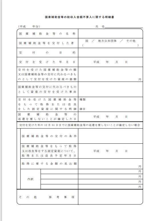 しかし、「住まい給付金」は国庫補助金等に該当し、確定申告書に「国庫補助金等の総収入金額不算入に関する明細書」を添付すれば、一時所得に含めないことができます。